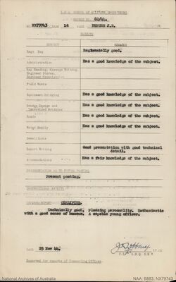 He enlisted in the AIF in December 1941 as a Sapper in the Engineers and was sent to Tamworth. He was made a Lance Corporal and after going to NCO School became a Lance Sergeant. Hunter was drafted to Singapore but because of the rapidly advancing Japanese forces this move did not take place, so he was sent to the School of Military Engineering to complete an officer-training course. He graduated as a Lieutenant and in May 1942. His military file at this time records him as “Technically Good, Pleasing personality. Enthusiastic with a good sense of humour. A capable young officer”. Please refer to the adjacent image.