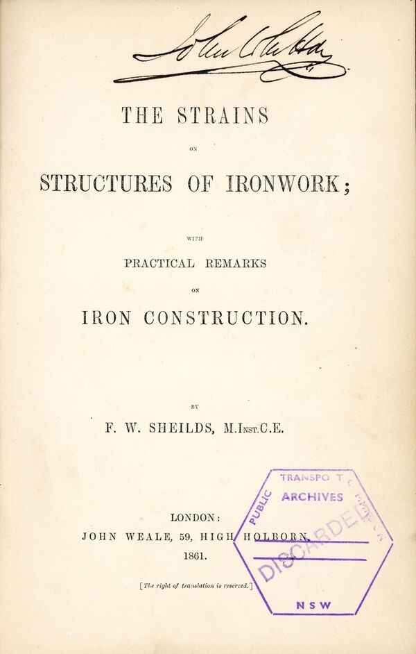 A small red cloth-covered book of only 56 pages titled The Strains on Structures of Iron Work, by F.W. Sheilds, may seem to be just another old textbook of structural mechanics, quaint in its terminology and simple in its analysis by later standards, until the reader realises the connection between Sheilds and Australia, particularly New South Wales. Francis Webb Sheilds was, in April 1848, the first engineer employed by the Sydney Railway Company. While his tenure did not extend to see the first railway operating, the present Main Suburban Line, from Sydney to Parramatta, remains on his selected alignment, and so a very large proportion of Sydney commuters traverse his route every day. Sheilds had been born in Ireland in 1820, though it is probably better to consider him to have been an Anglo-Irishman rather than an Irishman, for while the debate and debacle of railway gauge in Australia – Irish Gauge (5’3”, 1600mm) versus British Standard Gauge (4’8½”, 1435mm) – can be traced back to Sheilds, it would be simplistic to ascribe his recommendation to use the wider gauge as mere parochialism brought about by his place of birth.