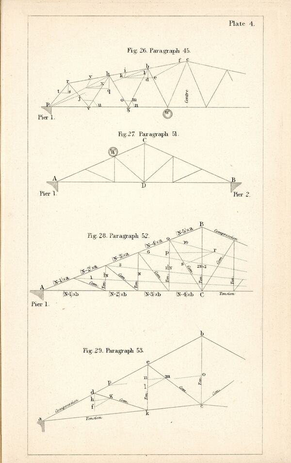 The book treats all girders and what would later be called trusses as a continuum. Starting with the most elementary concept of a simple beam with a central point load, Sheilds analyses ever more complicated spans ending with roof structures which must be considered trusses, though he never uses that word. His analysis is basically one of statics which implies without formal statement that at all joints in a girder fabricated as flanges and web members, the axial forces in the several members are in balance. He makes no mention of redundancy, for while he recommends opposed diagonals in panels where the member intended to carry tensile force needs to be in both directions as a load rolls across the girder, he makes no mention of the potential for their interaction. For highly redundant structures such as lattice girders he treats these as multi-layered (Warren) girders, each statically determinate, juxtaposed and carrying equal shares of the load. In practice of course the flange members are not simply adjacent but the same single iron members. His treatment of plate web girders is necessarily brief for he cannot analyse the web, though he does find them to be ‘excellent’.