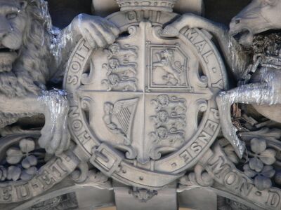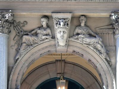 The keystone over the original centre bay on George Street is a single block of sandstone that weighed 27 tons and carries a carving of the British coat of arms. However, the motto has been miss-spelt as the ‘i’ is missing from the ‘Honi’ in ‘ Honi soit qui mal y pense’. Most of the carved figures on the building were done in a classical manner. The keystones of arches on the Martin Place façade show 24 heads representing either a continent, country or state.