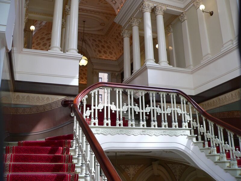 It is of Pyrmont sandstone and was built in two stages: Stage 1 extended from George Street mid-way to Pitt Street. It was commenced in 1865 and was completed in 1874 by John Young. When completed in 1874 it faced into the 12 feet (3.6m) wide St. Martin’s Lane and land had to be resumed to enable formation of the first stage of Martin Place.